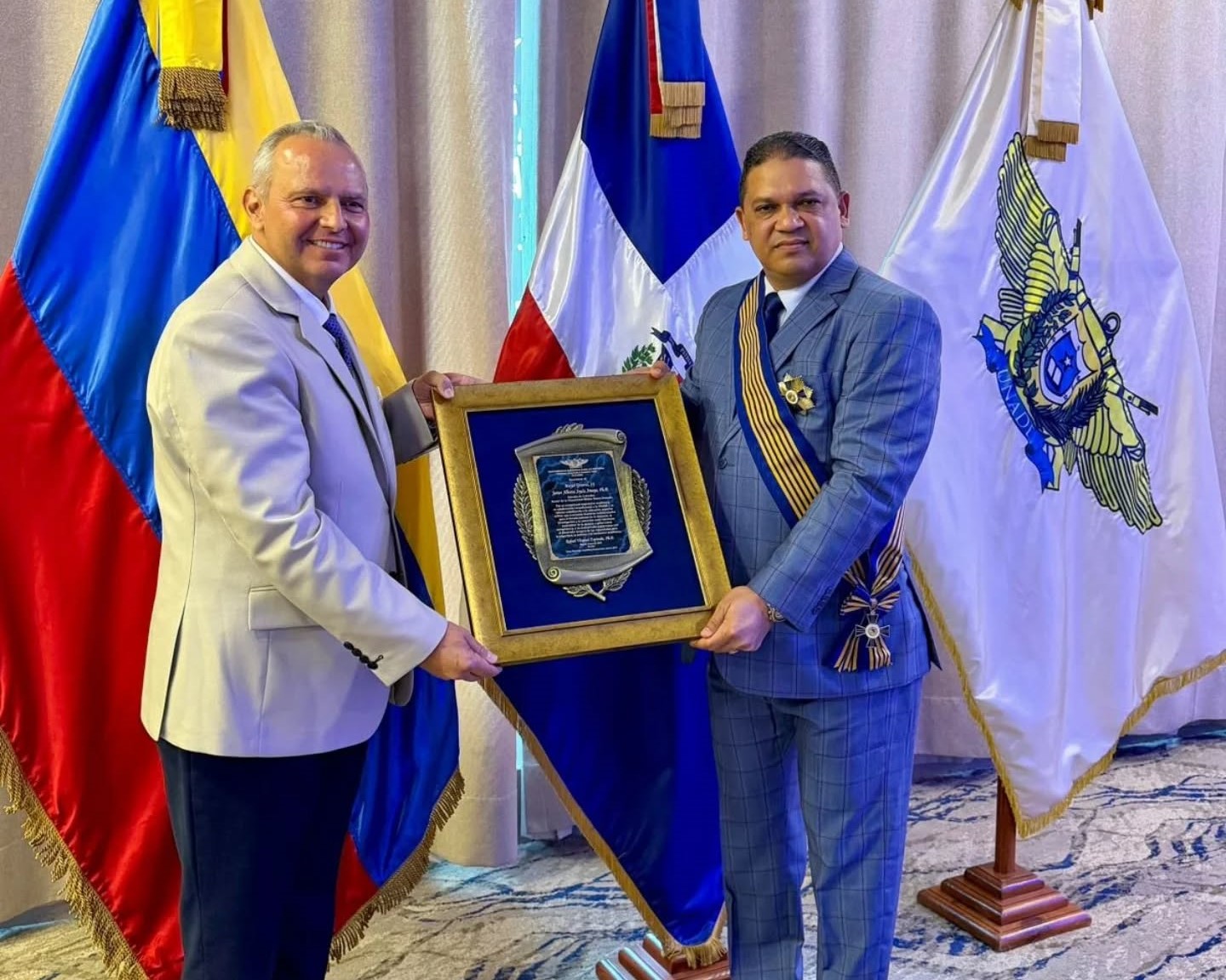 A su vez, la UMNG otorgó la Orden Gran Cruz Rectoral al MG Rafael Vásquez Espínola, rector de la UNADE, como símbolo de cooperación y compromiso con el intercambio de conocimiento entre Colombia y República Dominicana.